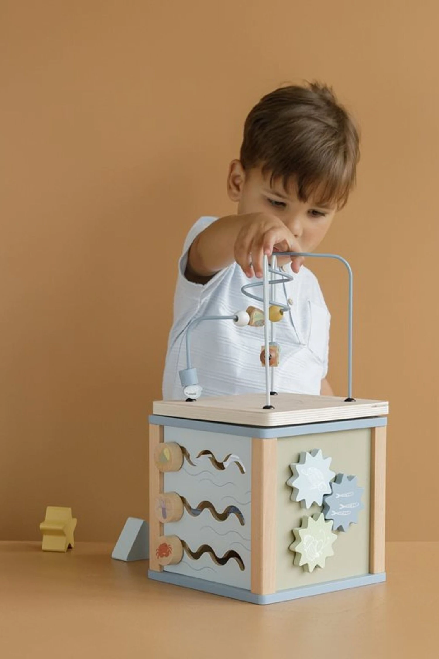 This wooden activity cube provides plenty of challenges for children. Each side features wonderful marine animals of the Ocean collection and offers a different educational activity, including a shape sorter, turning gears, puzzles and a fun bead spiral on top. With each activity, children develop their fine motor skills and are encouraged to use their creativity. This toy captivates children’s curiosity and brings lots of fun.