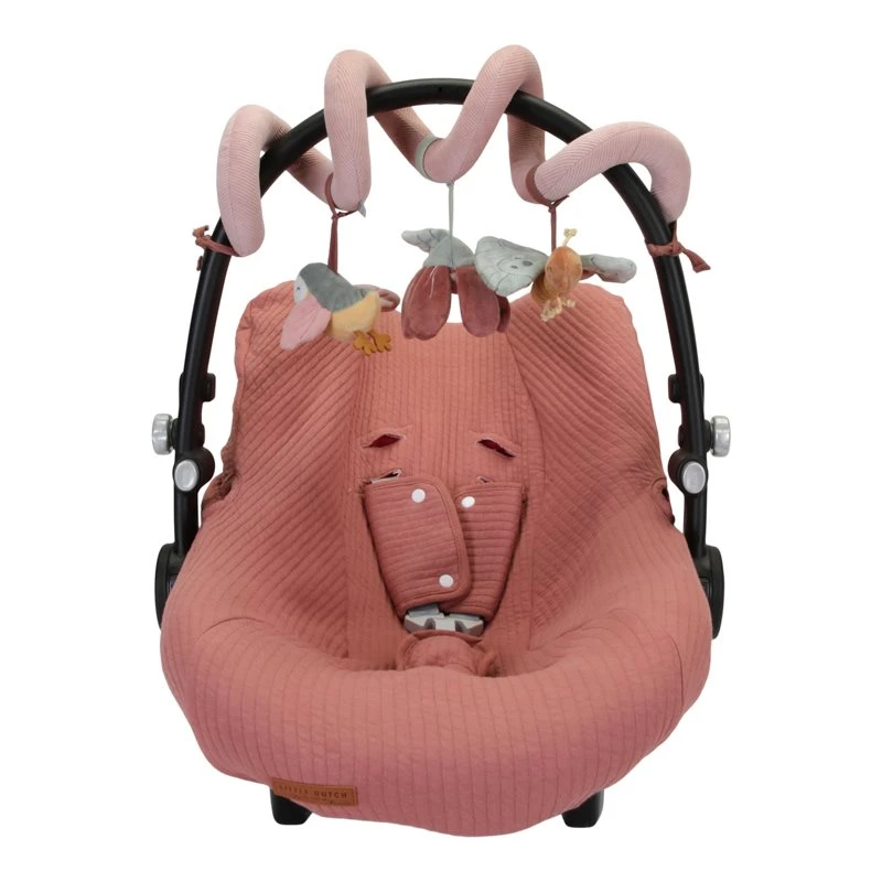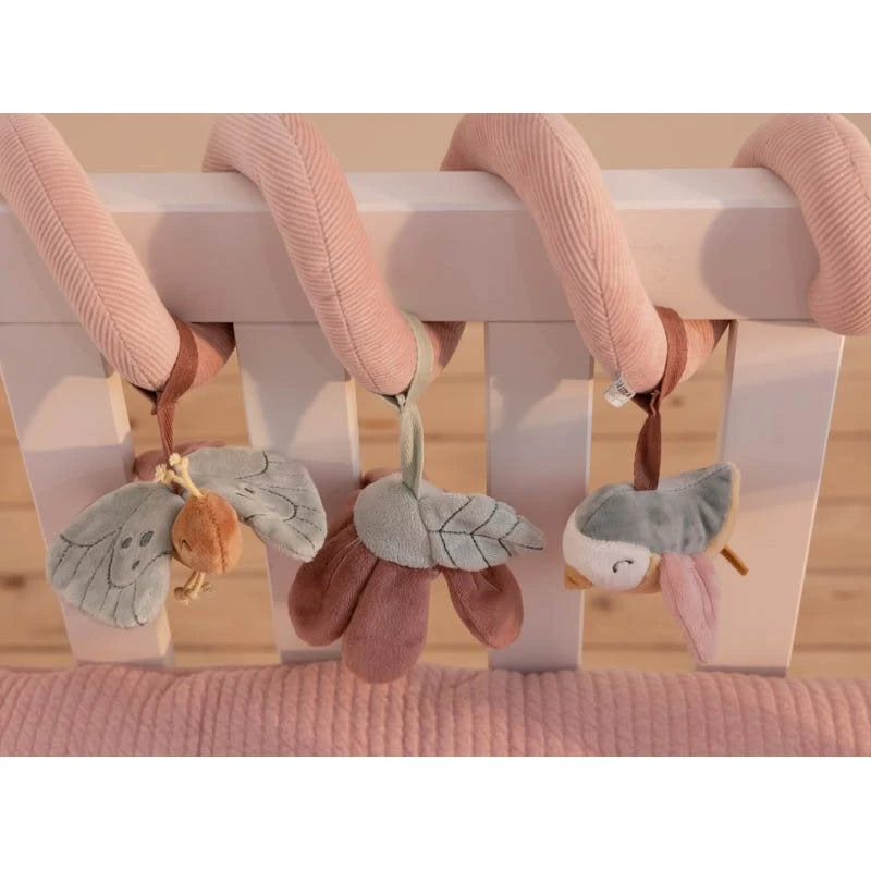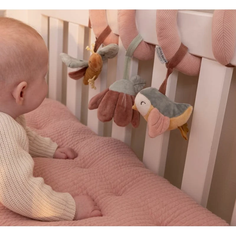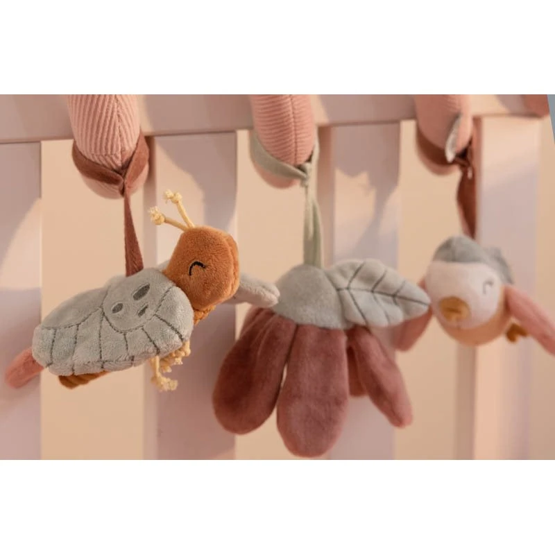 Look, touch and explore! This fun and entertaining activity spiral will engage babies both at home and on-the-go. It enhances their senses and stimulates hand-eye coordination. Easily attach this practical toy to everything from cot to car seat and playpen. Crafted from corduroy and cotton, it features three different sensory characters, including a little bird, a colorful butterfly, and a captivating flower that makes a rattling sound. From birth.