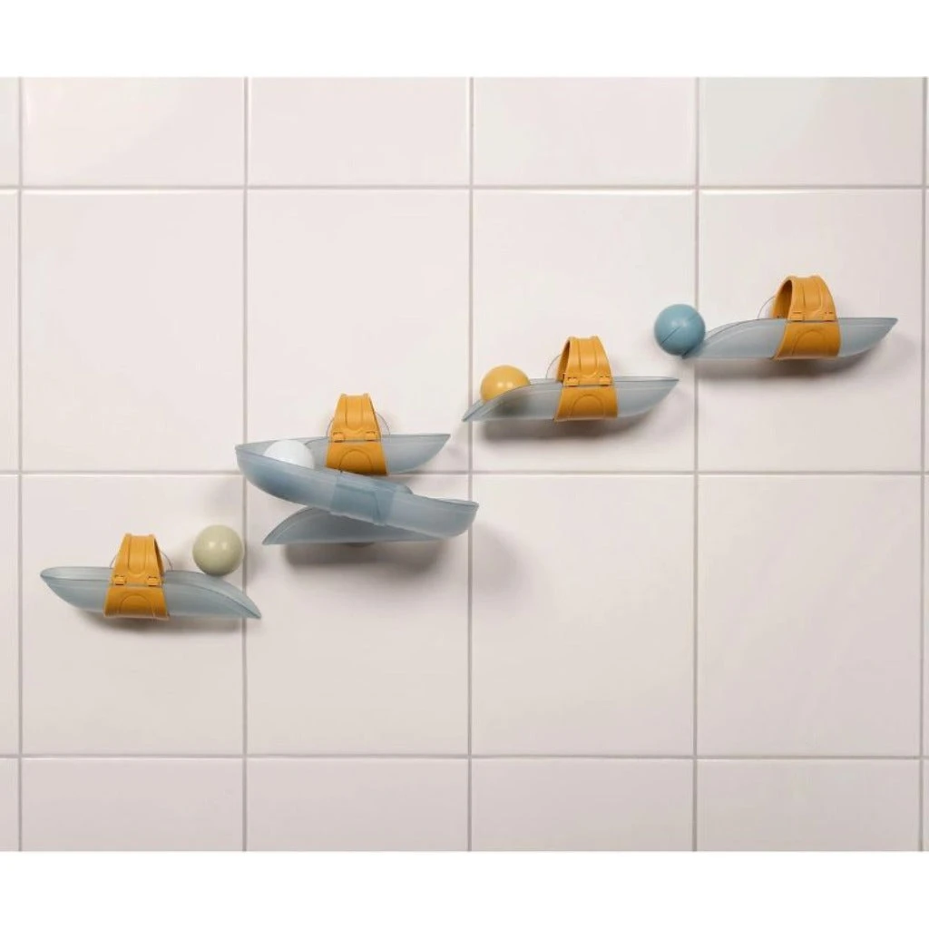 The 3 blue tracks have a suction cups that are easily attached to and removed from the bathroom wall. Thanks to the curved and straight shapes there are endless courses to be created.