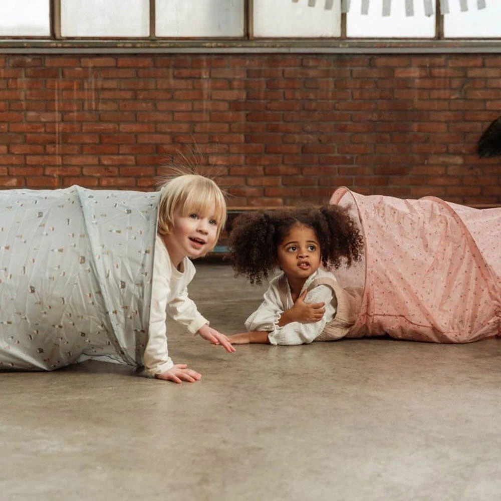 The crawl tunnel is light pink and decorated with the design of the Little Pink Flowers collection. It folds easily to be kept in the included storage bag.