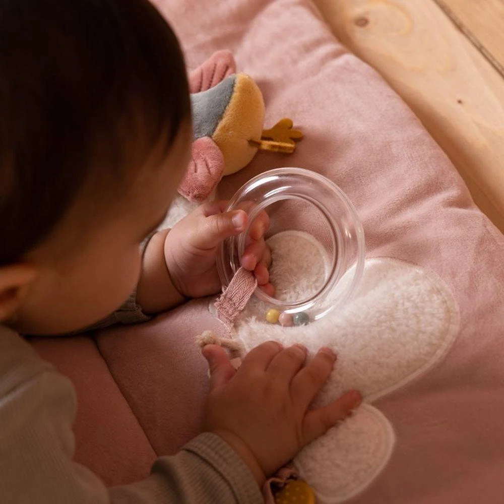 Meet the meadows. Defined by an array of textures and features, this padded playpen mat will stimulate your child’s senses. Made for hours of entertainment, there is so much to see and to discover for tiny explorers. The pink butterfly has fun crinkle wings and the little sparrow starts ringing when your baby plays with her. The playpen mat also comes with a little mirror and a transparent ring with 3 little beads that rattle when they move.