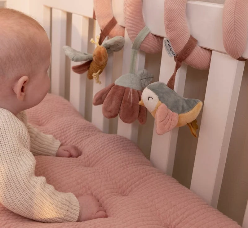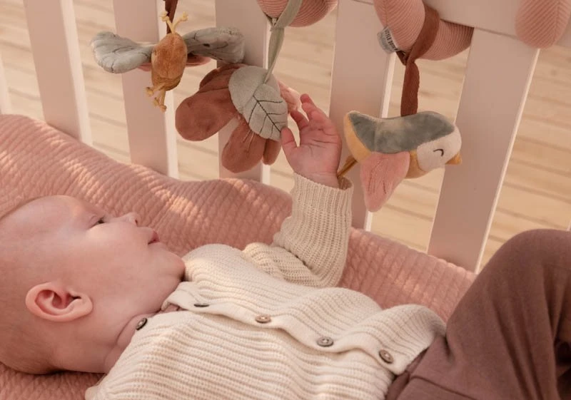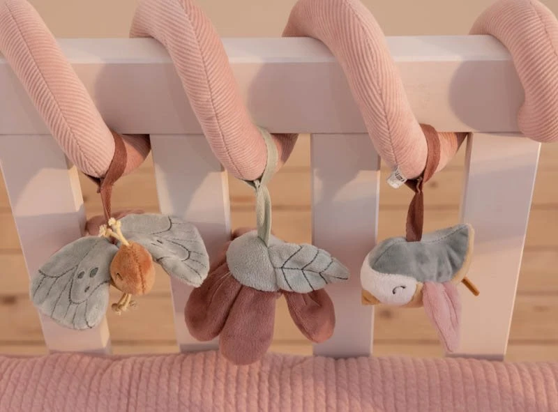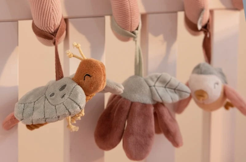 Look, feel and discover! This fun and entertaining activity spiral will keep babies entertained both at home and on the go. Easily attach this practical toy to everything from crib to playpen or car seat. It enhances the senses and stimulates hand-eye coordination. The activity spiral is made of corduroy with cotton and revolves around a small bird, a colorful butterfly and a fascinating flower that makes a rattling sound. â€