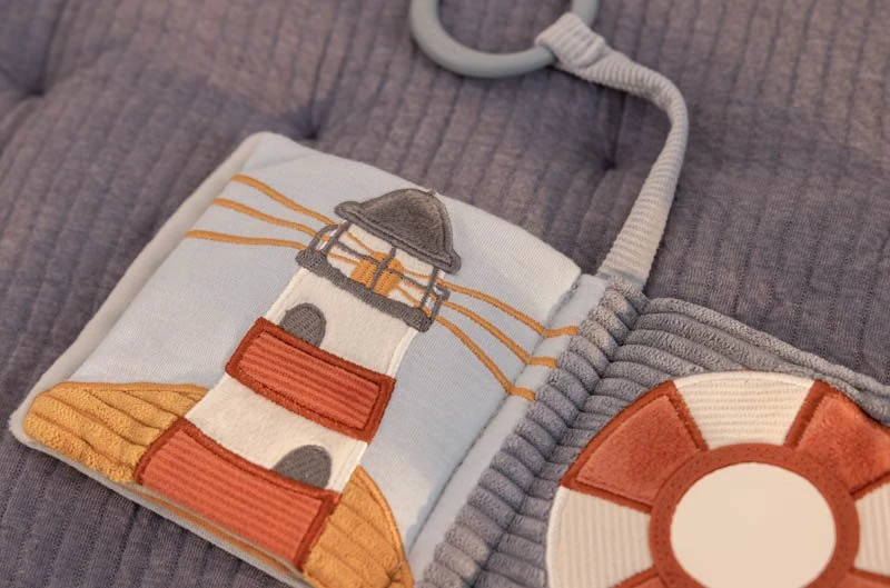 Rattling sounds, crackling fabrics, and a life ring mirror. There is so much to explore in this enchanting stroller booklet. Made from various touch-and-feel textures, it revolves around life in Sailors Bay. From swimming seagulls to a pelican that scoops up fish with his beak. Every page contains colourful illustrations and offers interesting activities that encourage hand-eye coordination. Attach the loop to the stroller for entertainment on-the-go.