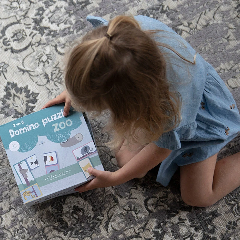 This 2-in-1 Little Dutch domino puzzle is a fun picture recognition and number matching game. Each domino card has two sides. On one side, the card features two pieces of animals. On the other, there is a game of dominoes in lovely colours. The game stimulates puzzle skills, social skills and the ability to concentrate. Game instructions are included.