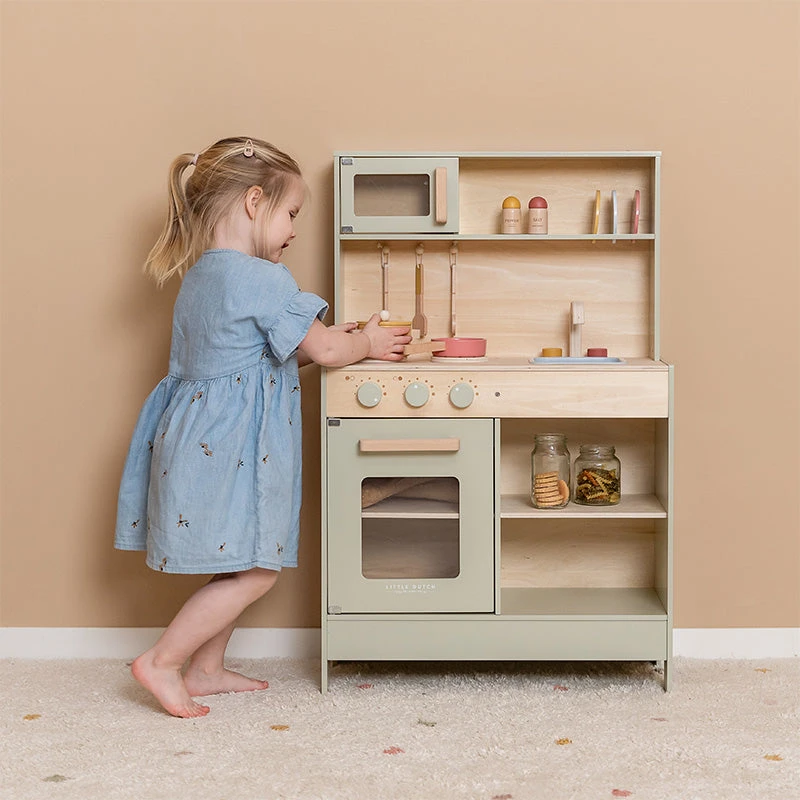 What are you cooking, little chef? Prepare the tastiest dishes in this cute wooden kitchen. Spoil your family or your favorite dolls and cuddly toys with a homemade meal. With the two pans and utensils you are ready to become a master chef! The kitchen offers everything you can think of. You can bake a pie in the oven, cook some veggies on the stove, and don’t forget to wash your hands in the sink. There is even a salt and pepper set and a cupboard to store your groceries.