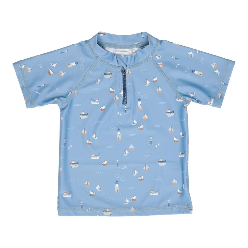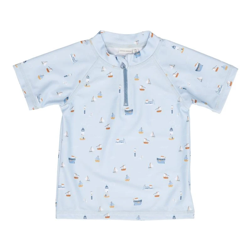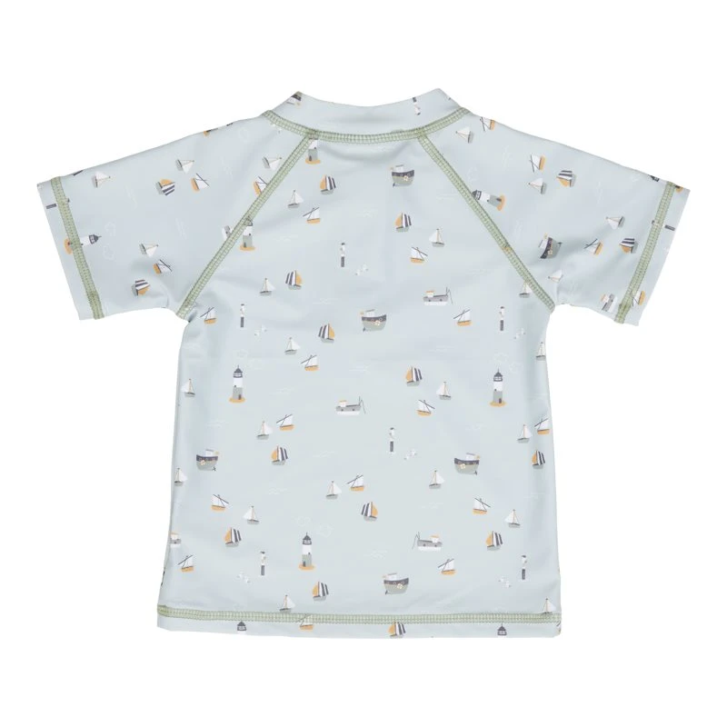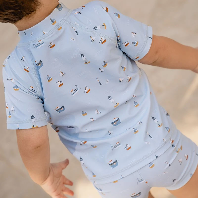 Are you ready for a day of water fun? This short-sleeved rash guard of recycled polyester will keep you warm in the water and protects you from the sun while you play all day long. Whether you love to surf the water or float around in a swim ring, this rash guard is the perfect choice for summer activities at the seashore. Light green and covered in the seagulls, lighthouses and sailboats of Sailors Bay, this short sleeved rash guard gives your little surfer a cool nautical look as well as a comfortable fit. The zipper helps to slip in and out of the t-shirt, even when wet. The rask guard is made from UV protective fabric and is available in sizes 62/68, 74/80, 86/92 and 98/104. Pair with the matching swim short and turn it into a two-piece swimsuit. Bring a towel and a swim ring and you have all the essentials for a day at the beach or pool. Don’t forget to always use sunscreen lotions to protect your little one.