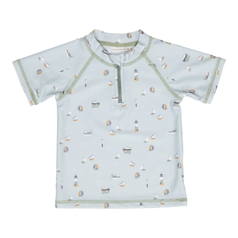 Are you ready for a day of water fun? This short-sleeved rash guard of recycled polyester will keep you warm in the water and protects you from the sun while you play all day long. Whether you love to surf the water or float around in a swim ring, this rash guard is the perfect choice for summer activities at the seashore. Light green and covered in the seagulls, lighthouses and sailboats of Sailors Bay, this short-sleeved rash guard gives your little surfer a cool nautical look as well as a comfortable fit. The zipper helps to slip in and out of the t-shirt, even when wet. The rask guard is made from UV protective fabric and is available in sizes 62/68, 74/80, 86/92 and 98/104. Pair with the matching swim short and turn it into a two-piece swimsuit. Bring a towel and a swim ring and you have all the essentials for a day at the beach or pool. Don’t forget to always use sunscreen lotions to protect your little one.