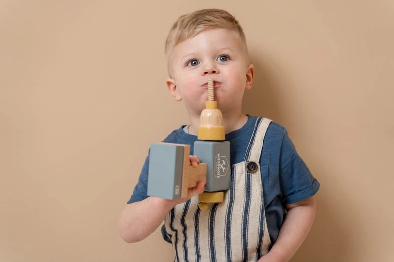 Drill, screw and twist! With this wooden toy drill you can repair almost anything. What will be your first DIY project? Choose one of the three interchangeable bits, attach it to the head of the drill and get to work. Turn the wheel at the back to drill. That way you are just like a real carpenter!