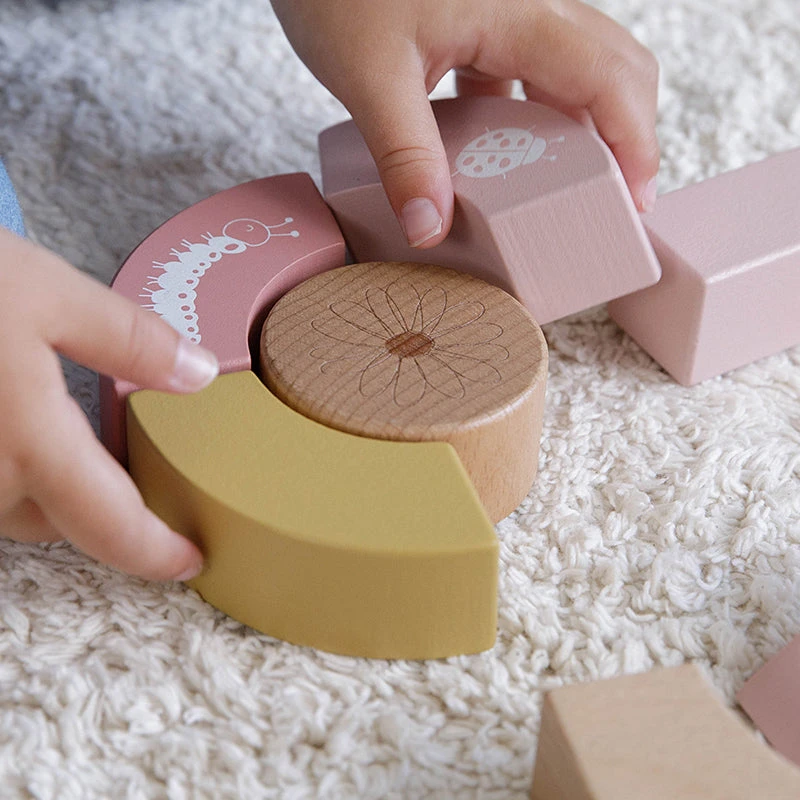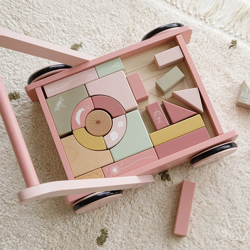 The block trolley has wooden wheels and is filled with colored wooden blocks with beautiful drawings of flowers and insects from the Wild Flowers collection. The different sizes of the blocks promote the recognition of colors and shapes by children.Â