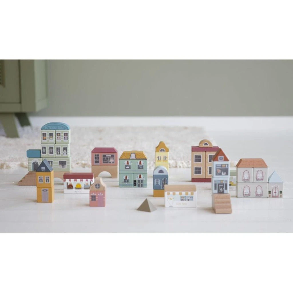 This Little Dutch’s urban-style playset is perfect to be used together with the wooden railway set. It includes 50 blocks to create town buildings, like shops, a hotel and a restaurant.
