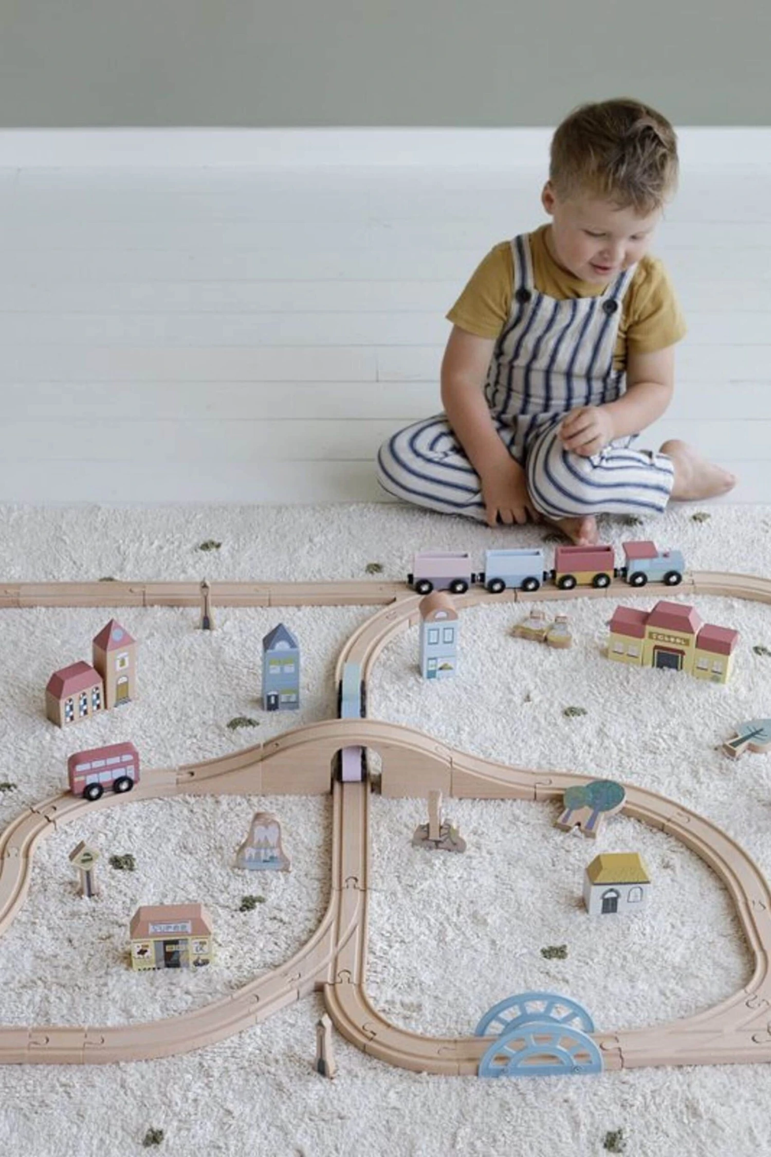 Go on endless adventures with the Little Dutch wooden railway track. Hop on board the train, the bus, the taxi or the car and explore the town. With more than 100 parts, this set offers many options to get creative and build new combinations over and over again. Each of the wooden figurines and elements has detailed illustrations on both sides. Additional playsets, such as vehicles, a zoo and a garage, are available for even more hours of fun play.
