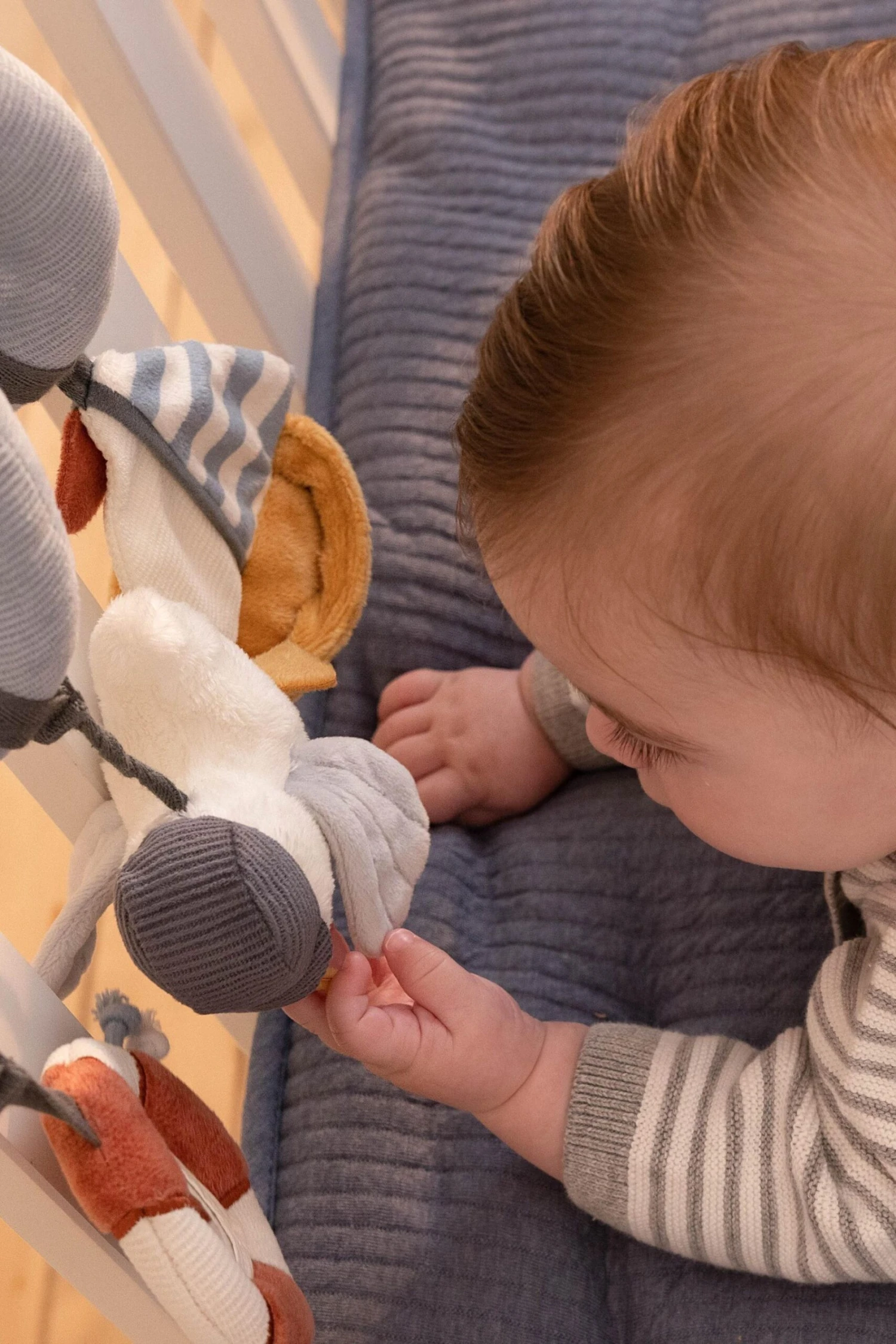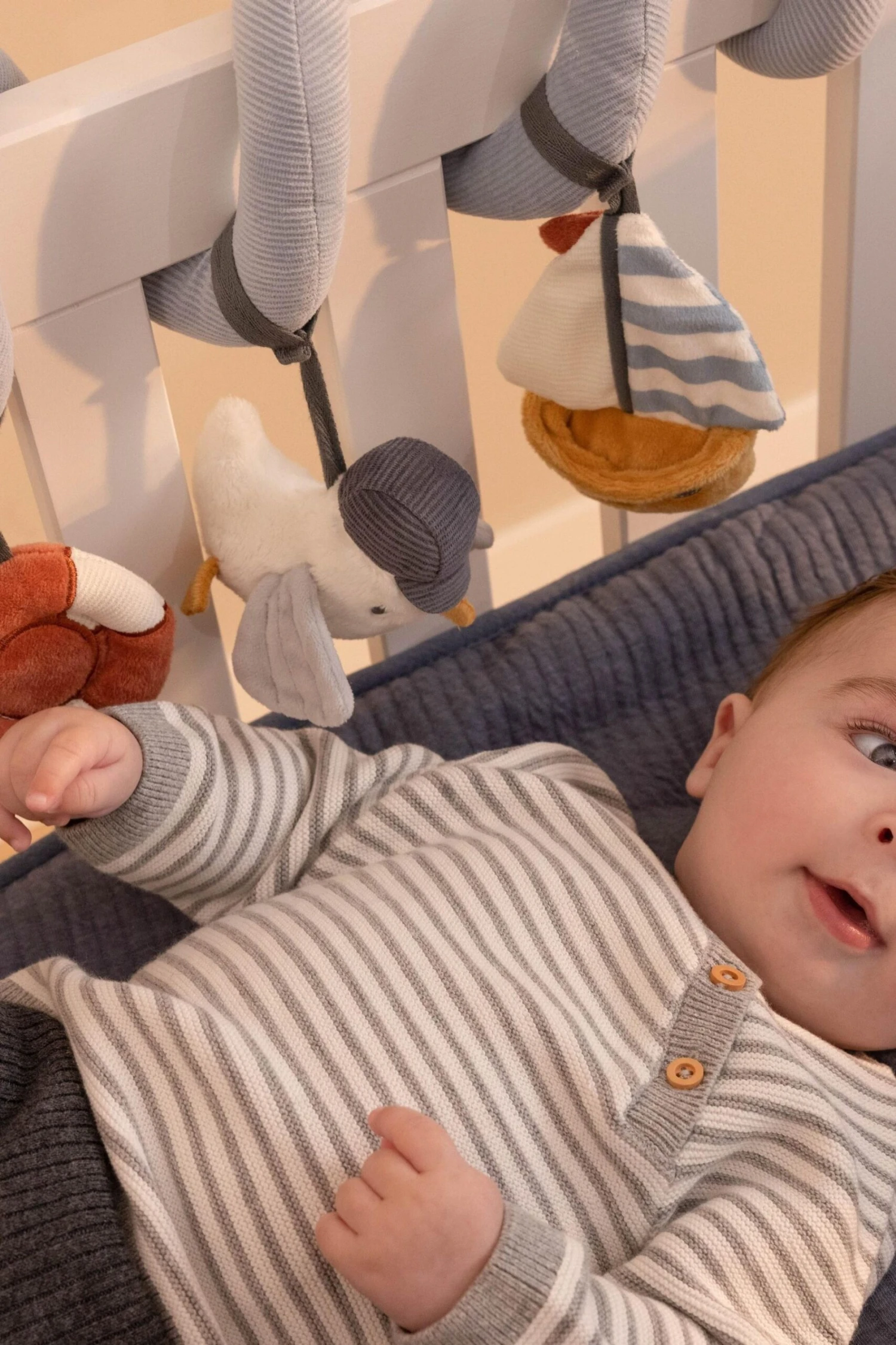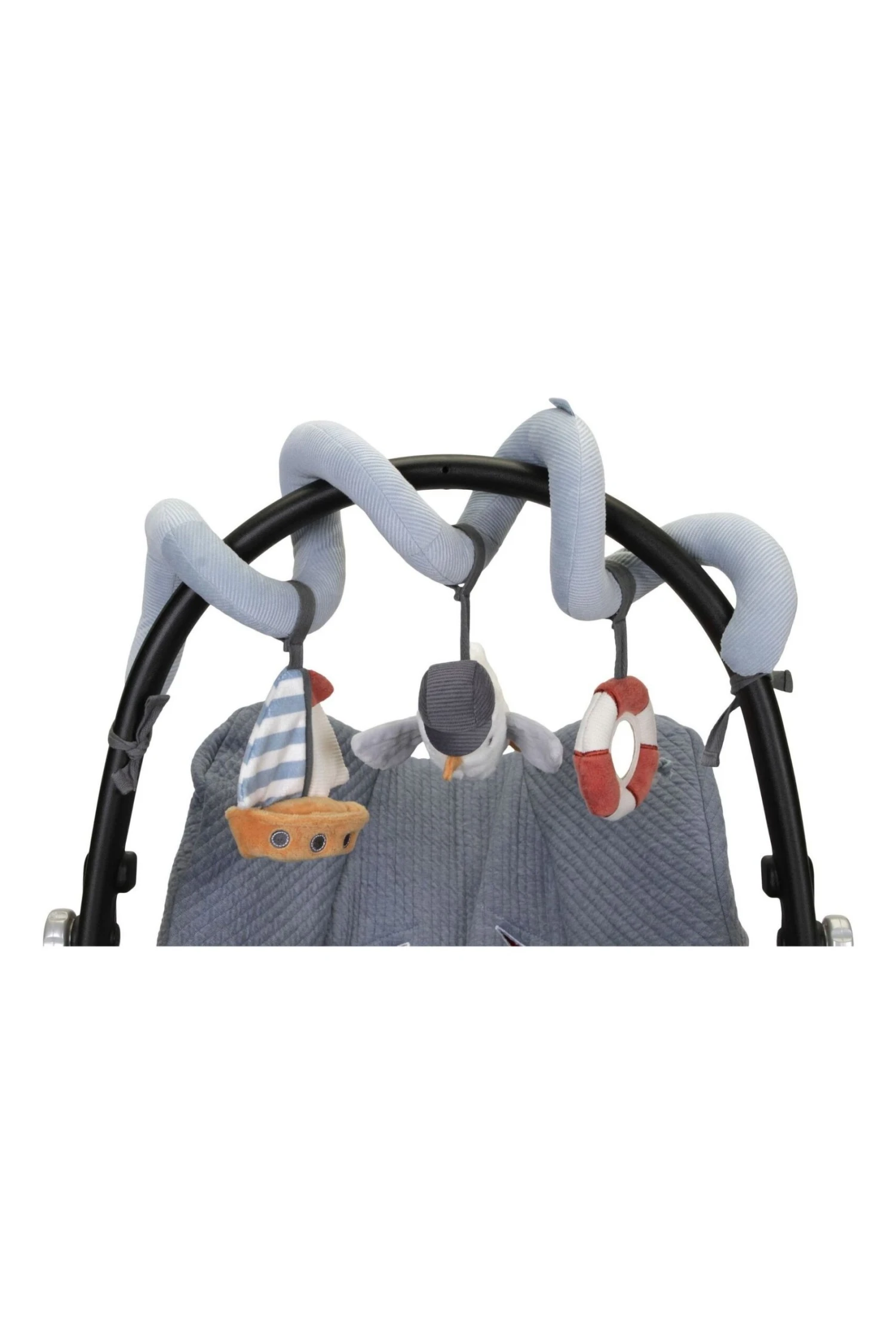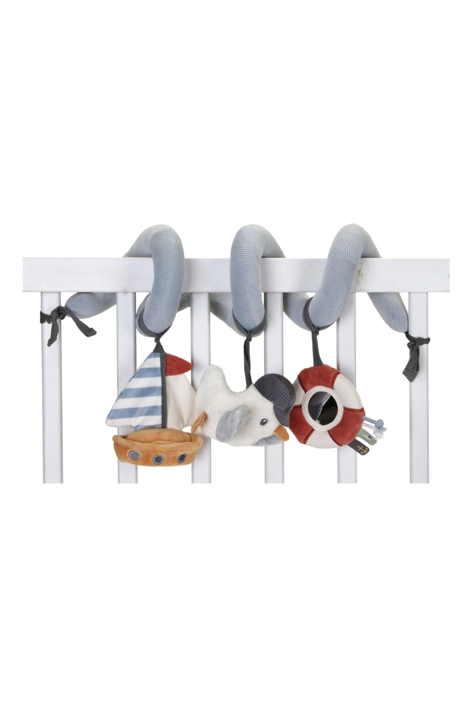 Ahoy there, sailor! Make every day a bayside adventure for little ones with this inviting activity spiral. It stimulates your baby’s first hand-eye coordination and makes for hours of entertainment. Crafted from cotton and corduroy, this touch-and-feel sensory toy includes a hanging seagull, a sailboat and a life ring with various fun labels and a mirror for self-discovery. It’s easy to attach to everything from playpen to car seat and stroller.