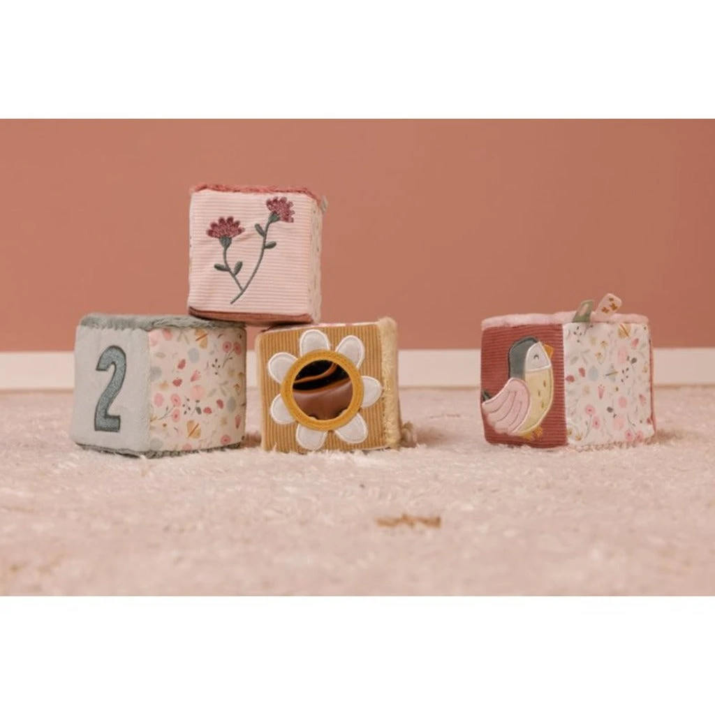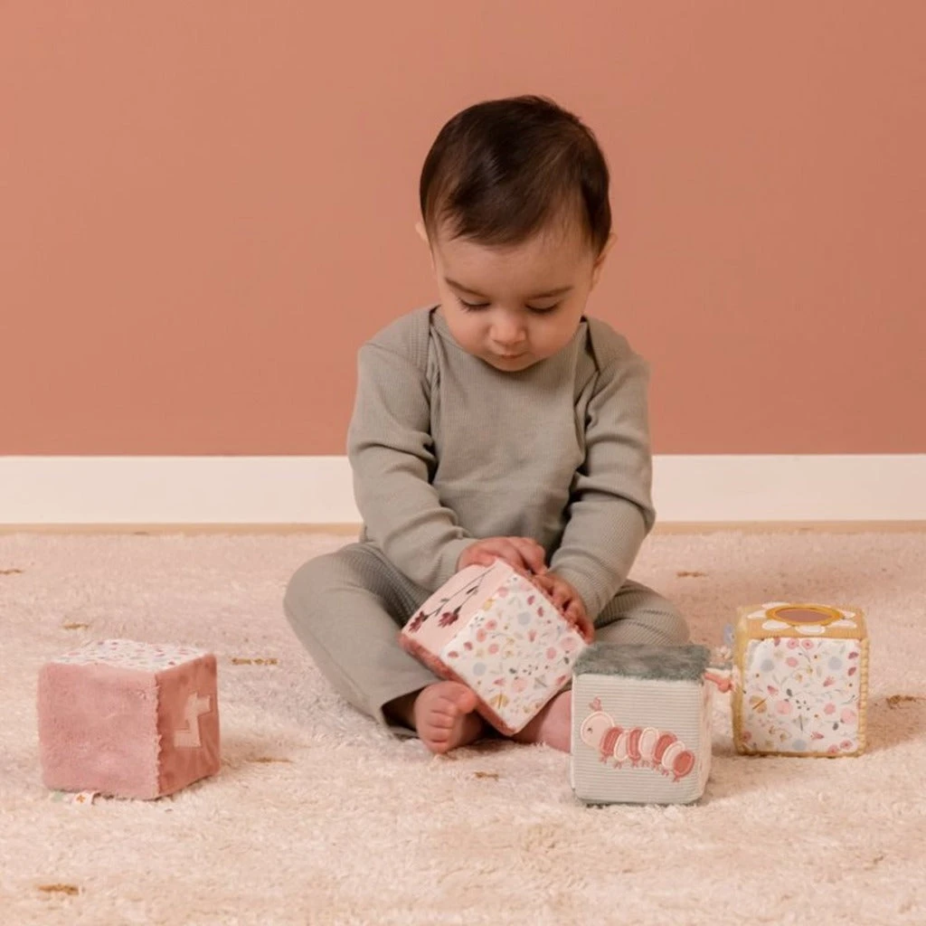 The cheery set consists of 4 multi-sensory blocks, each one defined by soft colours and decorated with a unique number. Baby hands will also discover our captivating labels, plush panels, and a sunny mirror.