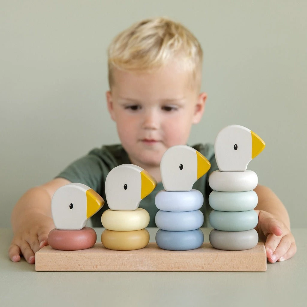 Mix and match the colours of this family of four. This Little Goose stacker of 14 pieces will help your child to learn how to count from 1 to 10 and develop hand-eye coordination.