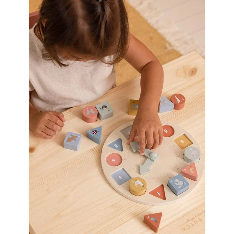Each piece is beautifully illustrated with an animal to make the learning experience much more fun. This Little Dutch puzzle clock is also a great for learning colours, numbers and shapes. They will learn how to count and recognise the numbers and colours by matching the right shape, colours and number with the right slot. Designed for ages 2 and up.