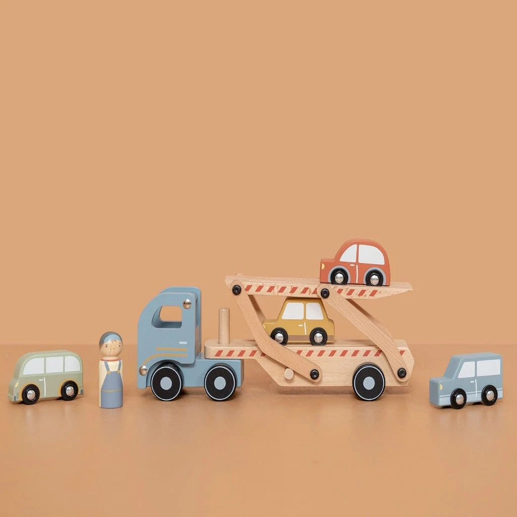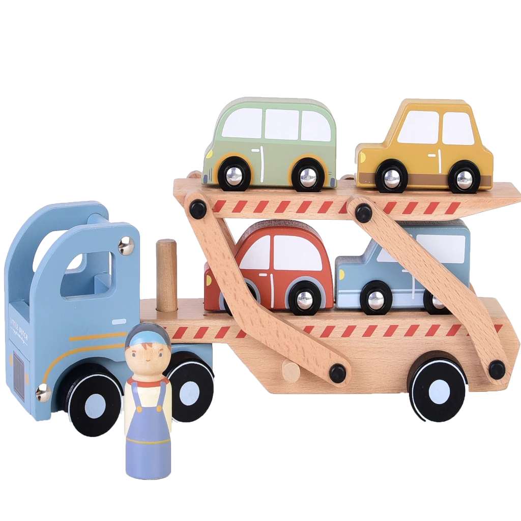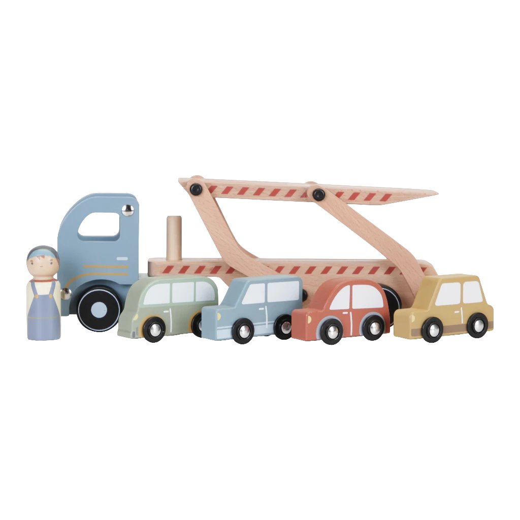 The Little Dutch wooden transporter with trailer including 4 cars will not go unnoticed when it passes by your little one!